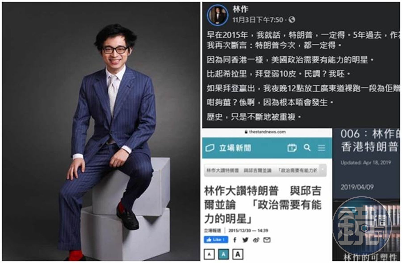 港姐冠軍麥明詩的前男友林作,日前在臉書直言川普一定連任,「因為跟香港一樣,美國政治需要有能力的明星。比起希拉蕊,拜登弱10倍。民調?我呸。」甚至還祭出超狂祭品文,「若拜登當選,他就去廣東道裸奔為拜登慶祝」。