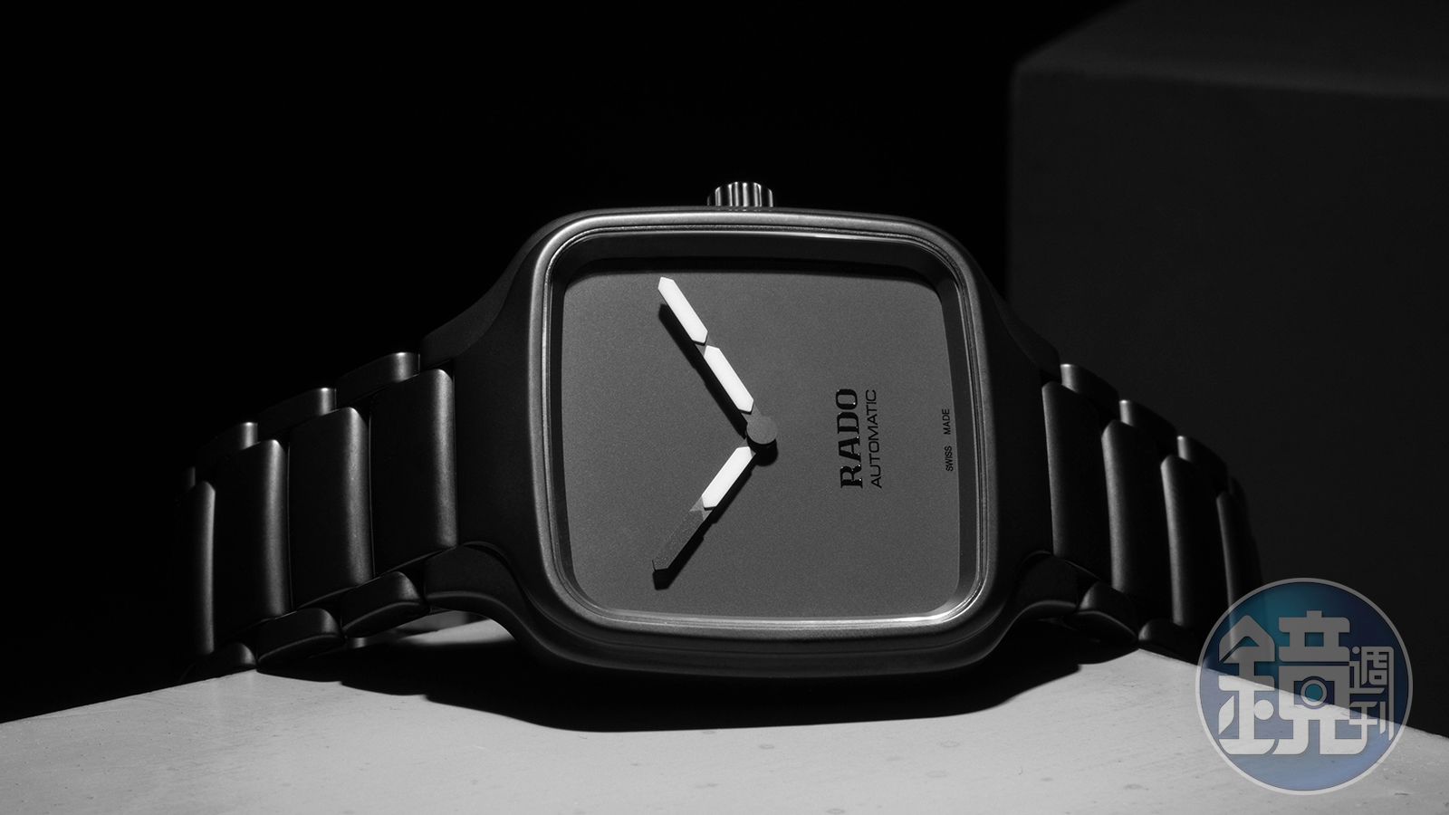 另一款True Square是由義大利的雙人設計公司FormaFantasma操刀。FormaFantasma的風格向來實驗性質比較濃厚,他們擅長解構、喜歡鑽研材質,有著一股新銳設計師不按牌理出牌的氣息,不過在設計上依然沒有譁眾取寵地悖離產品設計的本質,成品看上去有些前衛,但一切卻都做了務實的考量。所以FormaFantasma曾在訪問中提到,在設計燈具的時候,他們設計的是光、不是燈,觀察人與光的共處關係才能知道怎麼設計出好的燈具。回頭來看他們這次幫雷達設計的True Square,他們大範圍的用白陶瓷包覆著方形面盤,留下中間一個小小的圓形視窗,三根指針都是半徑的長度,以粗細區隔出時分秒針,乍看下像是螺旋槳或是吊扇,時間彷彿在推進中被撥動著,而在方形面盤中挖了一個圓形視窗,也很不著痕跡地以幾何區塊做出了對比,讓視覺可以更聚焦。