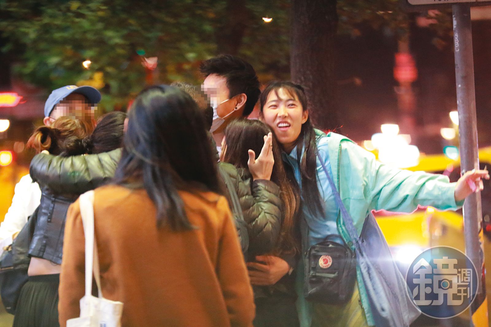 5日凌晨1點多,王若琳跟一大群朋友從台北忠孝東路錢櫃走出來,一夥人在門口聊天,似乎不想唱完歌就此解散,王若琳穿著淺藍色外套相當顯眼,她和朋友輪流開心擁抱,其中還包含外國人,大夥兒就在門口聊天。