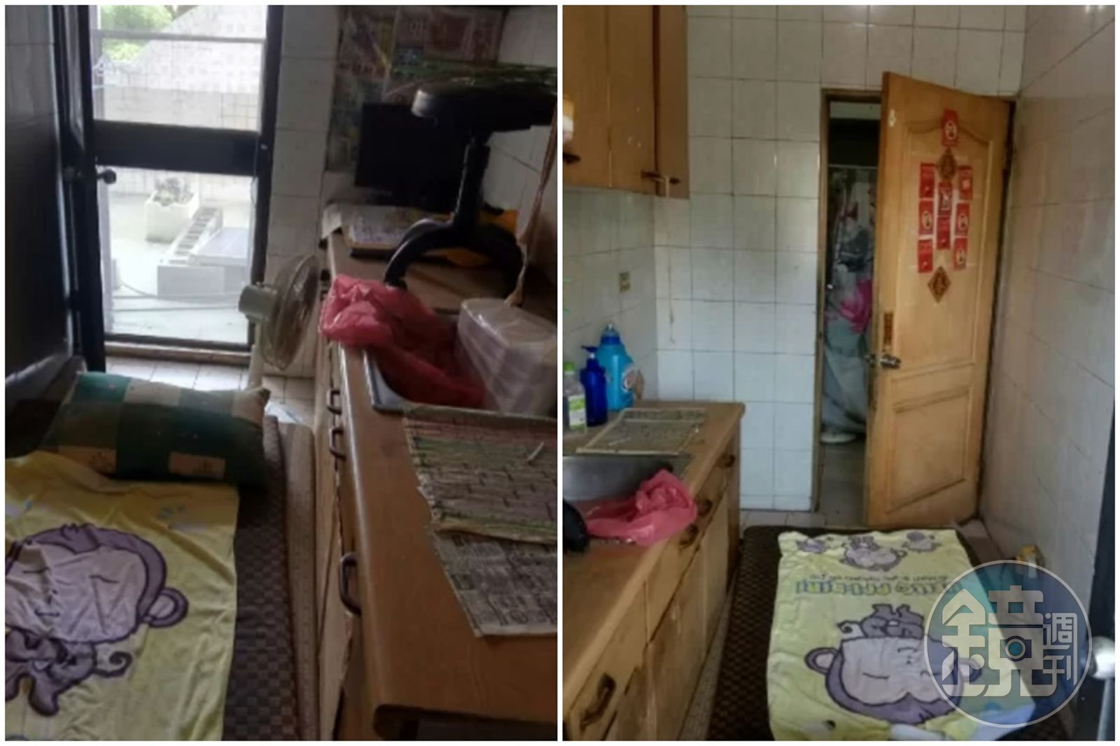 只見床鋪放在廚房的走道上,緊鄰一旁的流理台上還放著螢幕和椅子,加上牆上的櫥櫃,就能看出這間雅房根本就是廚房,空間相當狹窄。