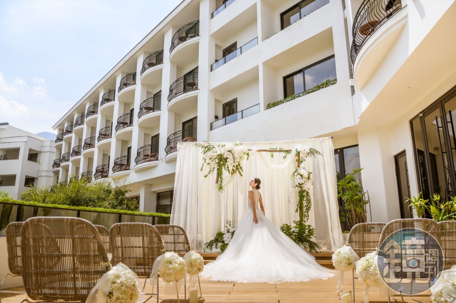 在婚禮內容上,不僅為才子佳人舉行2小時的證婚儀式,更由英國知名設計師團隊GA DESIGN操刀的WESTIN戶外教堂,蒼穹頂式鏤空的簡約挑高設計,深淺交錯的木質調色系與藍天綠蔭形成自然映照,更顯神聖感,在摯愛的家人好友前,許下天地為證的永恆誓言,為幸福更添上一筆繽紛祝福。