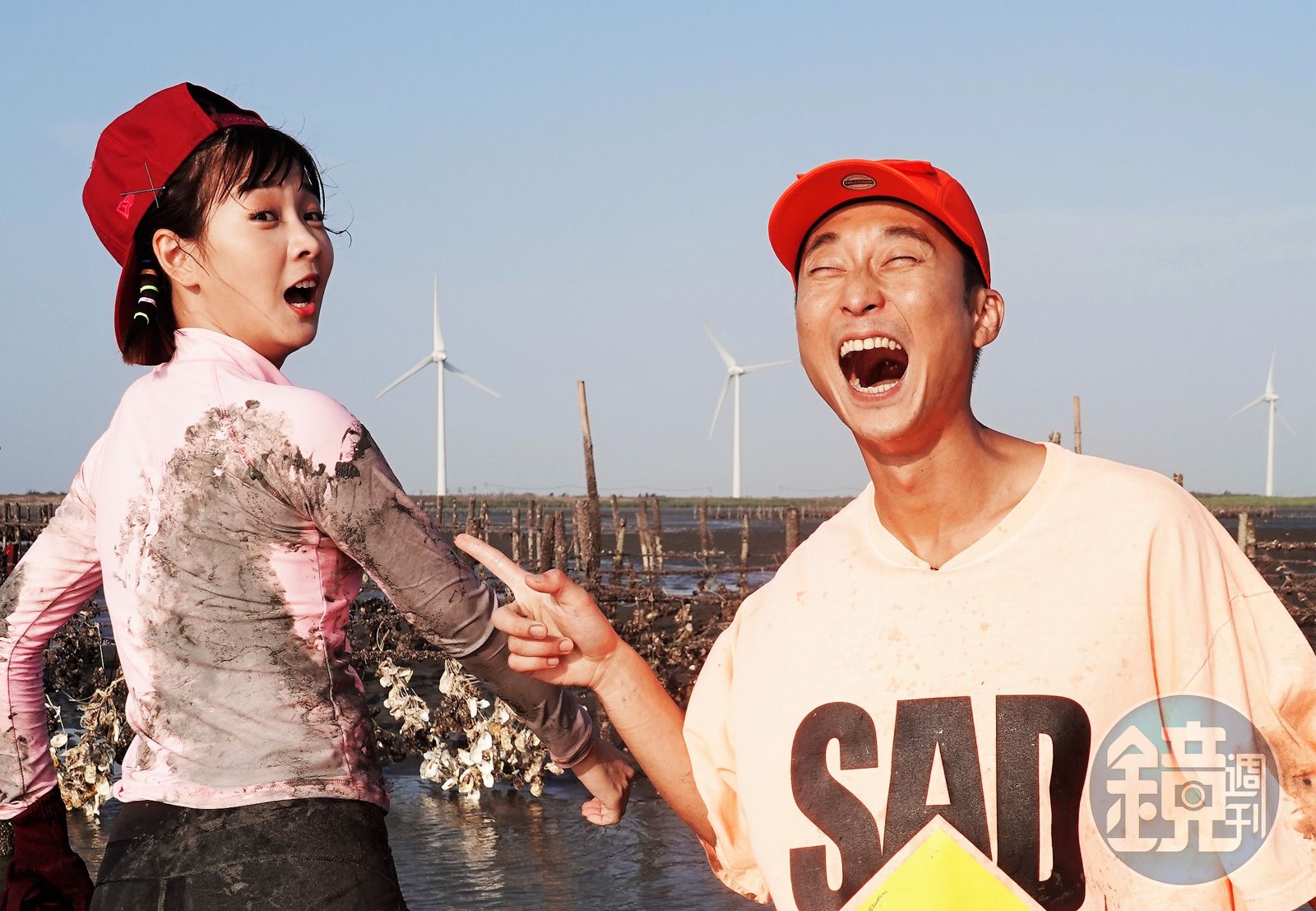 《綜藝新時代》在「浩子」謝炘昊、「阿翔」陳秉立的帶領下,一行人來到位於彰化芳苑海邊的潮間帶採蚵,地型泥濘讓藝人不好行走,而籃籃的腳更卡在泥中倒地求救,浩子見狀過去要扶她起來,沒想到浩子竟是假動作,讓籃籃撲空更深陷在泥中,弄的全身都是泥巴,調皮的籃籃起身要拉浩子下來淌這泥水,嚇的浩子四處逃跑,現場宛如在看一場泥漿摔角,連教他們採蚵的阿公看他們玩成這樣也笑的合不攏嘴。