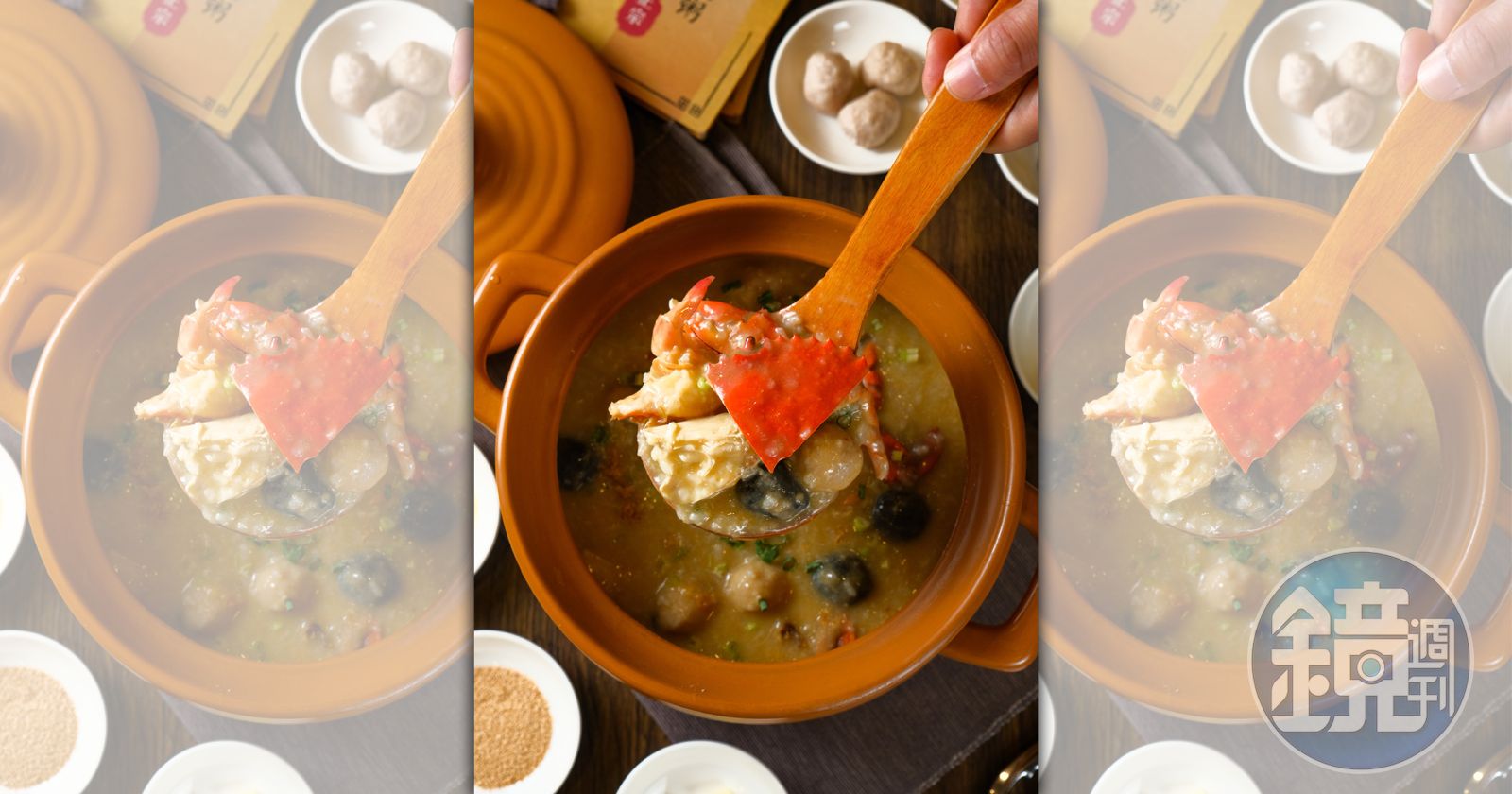 這粥底的功夫可不只那慢火熬煮的30分鐘,湯頭是加了許多蔬菜的大骨湯,米種也經過精心調配,花生醬、冬菜等隱味賦予了深度。鍋中主角豐儉由人,龍蝦、干貝、石斑、鮑魚,乃至土雞和菇類都可領銜演出,但這時節,當然要吃最當季的旬味。尚未抱卵的處女蟳,無限美好的青春蟹膏熬進粥底,滑潤、飽滿、鮮醇,紅蟳的成塊蟹黃實在難以匹敵。