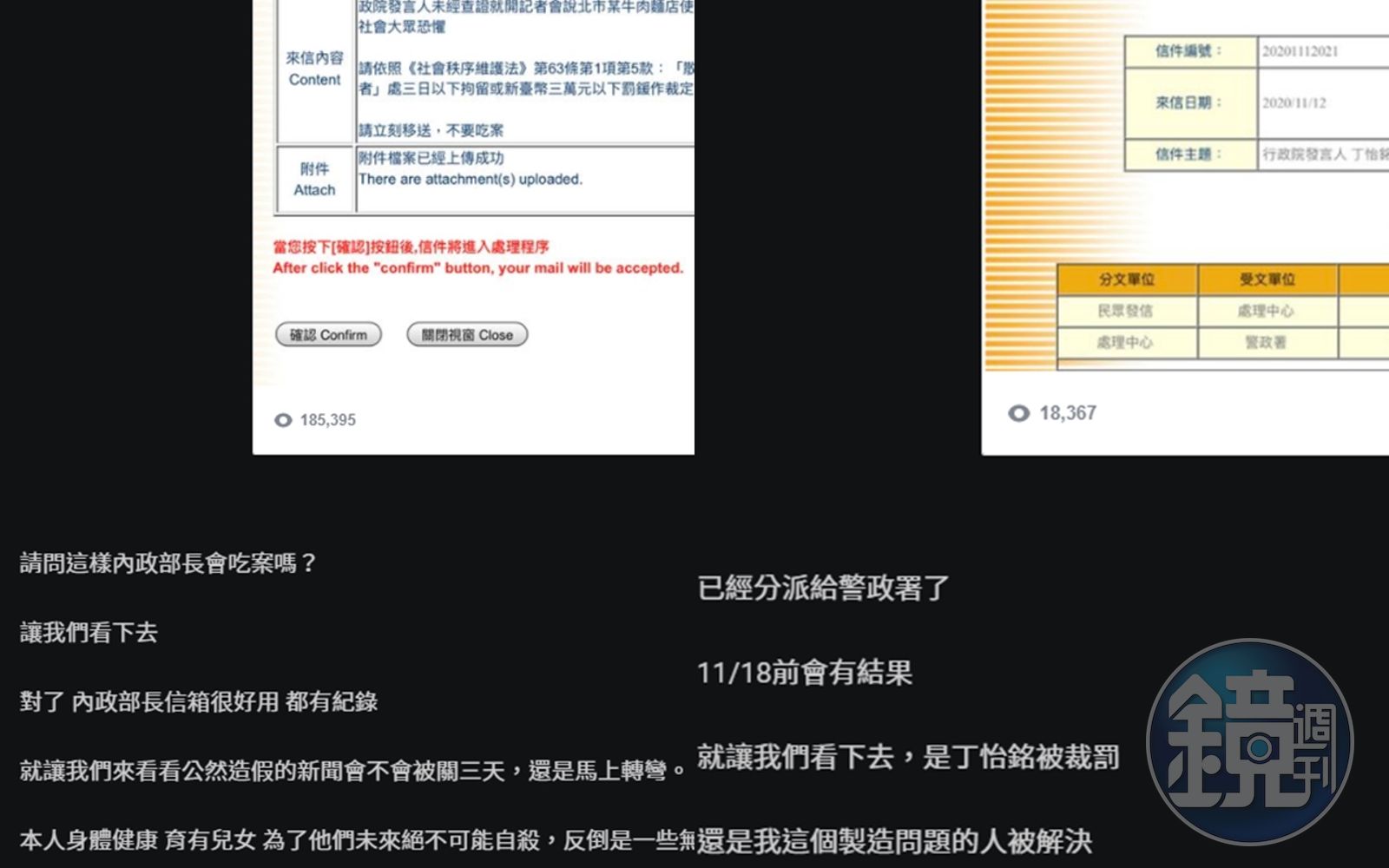 一名PTT網友向內政部長信箱檢舉丁怡銘散布假新聞。(翻攝自PTT)原PO之後又回覆舉報進度,表示此案已分派給警政署了,11月18前結果會出爐,並發表不自殺聲明,「就讓我們看下去,是丁怡銘被裁罰,還是我這個製造問題的人被解決。」 更新時間|2023.09.12 20:36 臺北時間