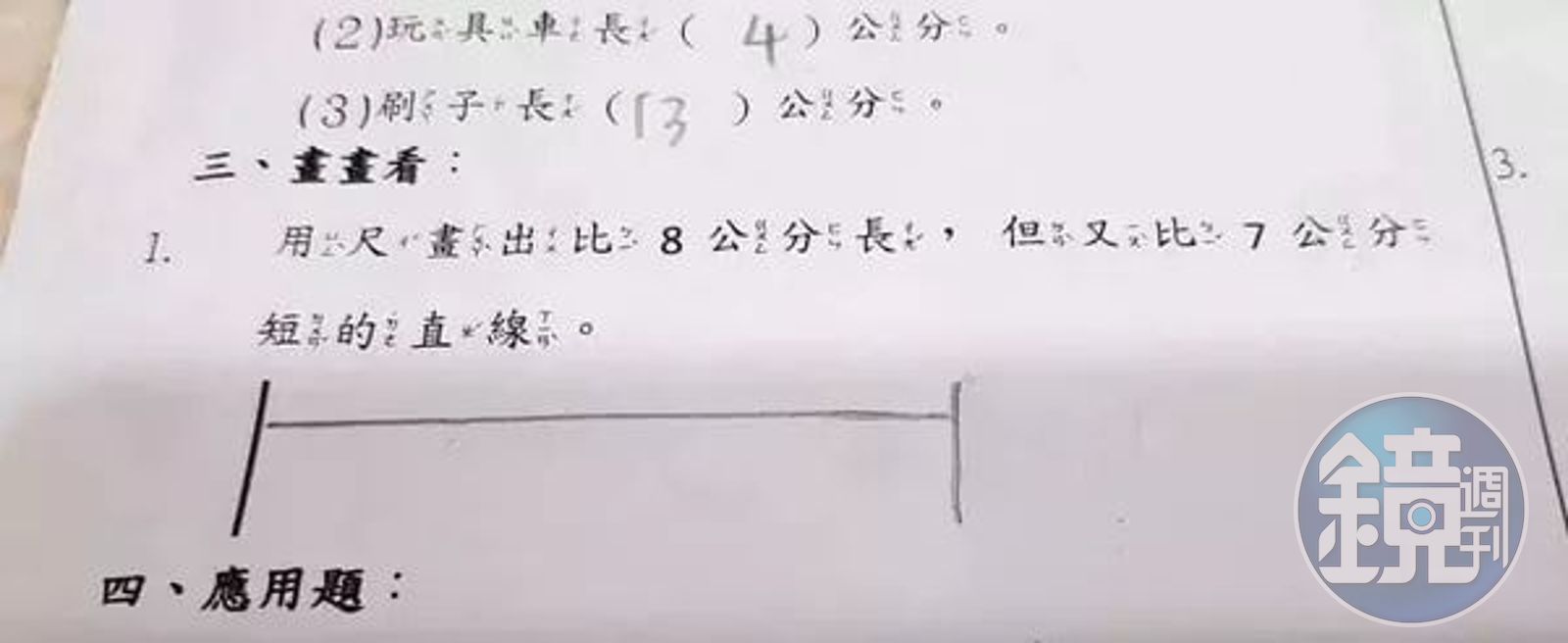 一名網友日前在臉書社團「爆廢1公社」貼出一張考卷照,上面寫著題目「畫畫看」,要學生用尺畫出一條「比8公分長,但又比7公分短的直線」。PO文一出立刻考倒網友們,許多人都認為可能是「題目打反了?!」「老師出錯題目」「老師你累了嗎」「這種線只有在天能的世界裡存在」。