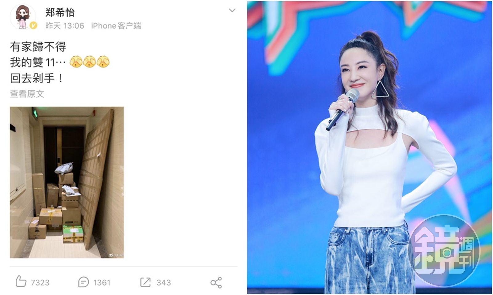 鄭希怡於15日在微博上發文更新近況,PO出一張家中大門的情景,她在微博寫下:「有家歸不得,我的雙11……回去剁手!」原來鄭希怡趁著雙11大打折瘋狂購物,以致包裹堆滿大門,連開門也要費一番功夫。 鄭希怡所買的商品中,小至僅如手機大小,大至可像是與床墊一樣大, 她的瘋狂也引起了大批網友討論,紛紛留言表示,「我想看你怎搬進去?」「也買太多了吧」「還以為要搬家呢」「姐姐好能買。」不過也有不少粉絲強烈要求她「錄個開箱Vlog」「還期待姐姐推薦好物呢」「來個開箱直播吧!」對她到底買了些什麼東西相當好奇。