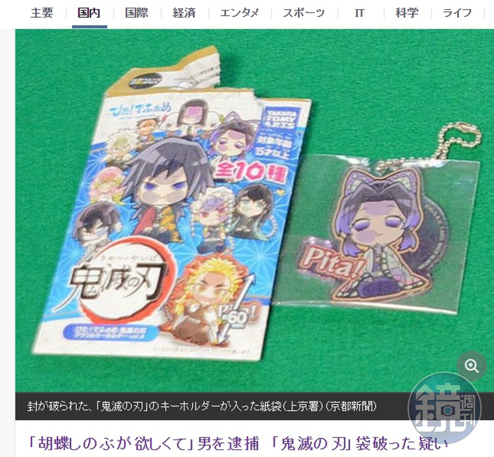 《鬼滅之刃》爆紅,連帶各式周邊商品大賣。日本警方表示,住在京都市伏見區的一名35歲男子在東京一家便利商店,因為拆封了3個裝有《鬼滅之刃》鑰匙圈的紙袋(一包售價660日圓)而被捕。