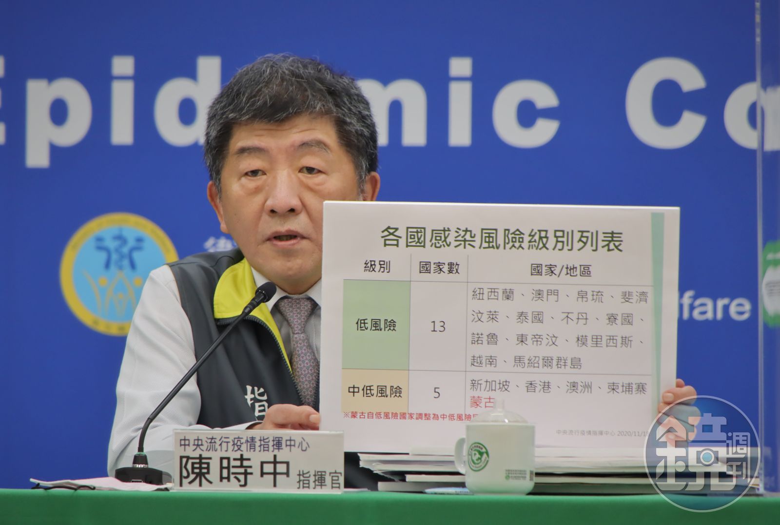 指揮中心指出,蒙古自11月11日報告首例本土社區感染病例,迄今已累積21例本土確診病例,目前全國實施居家令至12月1日,由於本土病例持續新增,因此即日起,該國從低感染風險國家調整為中低感染風險國家。各國感染風險級別最新名單如下: