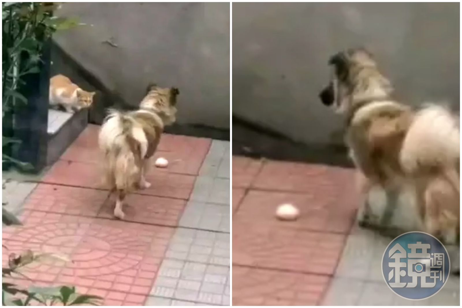 正當傅小姐納悶不已之際,一支流浪橘貓緩緩從樓梯走下,雖看著肉包想叼走,但仍對汪星人充滿警戒,隨即汪星人意識到自己嚇到貓,便後退了幾步,拉開安全距離,小心翼翼地搖尾巴等著對方,直到橘貓叼走肉包後,汪星人才又上前看著貓咪的背影,似乎還擔心對方沒拿好自己珍藏的肉包。