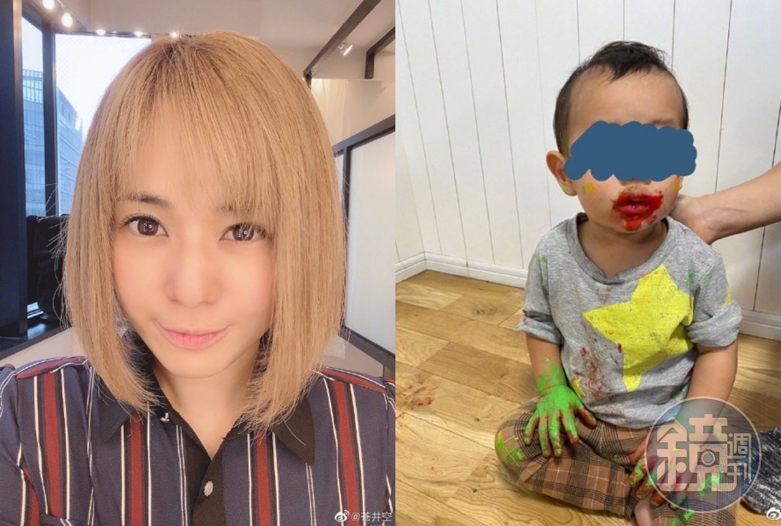 蒼井空的微博追蹤人數高達1,974萬,雖然「蒼井空」這3個字無法被檢索出來,她仍持續經營微博,分享她的日常與兒子們可愛的模樣。這次她拍下兒子將自己的身體塗鴉得五顏六色,臉蛋幾乎變成小丑妝的樣子,非常呆萌。蒼井空將照片配上文字「是我兒子」,加上了無奈笑的表情符號,讓粉絲留言,「打他屁股」、「是2千萬粉絲的雲兒子」、「打一頓就好了」。但也出現自以為好笑的粉絲留言:「他爸是誰,這可是個謎」,被網友群起攻擊「做個人吧」、「罵蒼老師可以,不要噴蒼老師家裡人」。