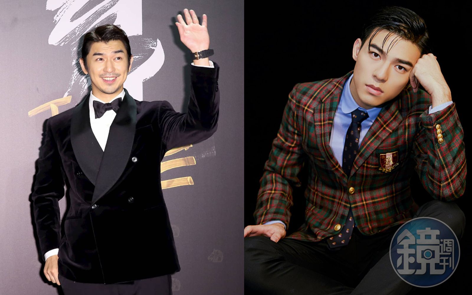 兩位新生代男神都選擇了雙排扣西裝 — —曾敬驊身穿DIOR箭領緞面細節晚宴套裝,簡單俐落,但或許再小一號會更合身。而陳昊森則身穿GUCCI晚宴服,他在領片上綴飾BVLGARI的Festa系列頂級縞瑪瑙與鑽石馬頭造型胸針,在細節上呼應金馬主題。