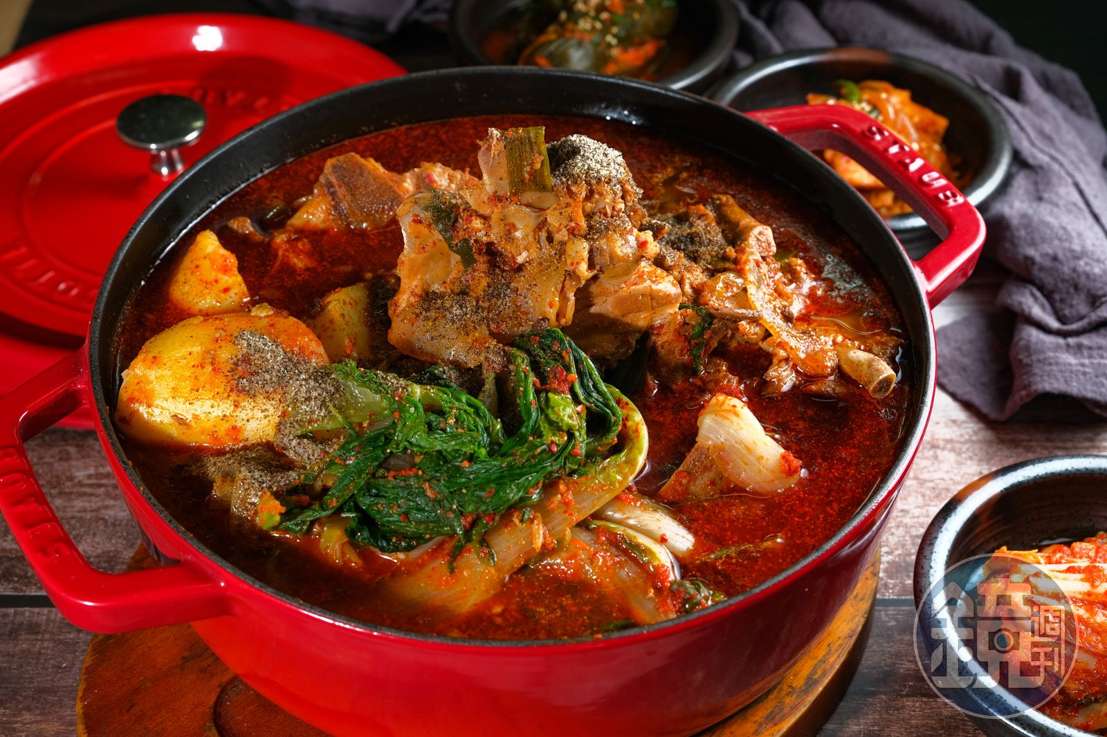 湯色紅艷的豬骨湯,以為會辣到猛在嘴邊搧風,結果辣感只在舌頭停留一下就消失,爽口深邃接著來,是食材精華燉煮兩個半小時,融進湯裡的證明,「蒜頭、洋蔥材料放很多,可是你看不到,對不對?因為通通都融化了,肉好吃,湯更好喝。」奉秀淨自豪地說。