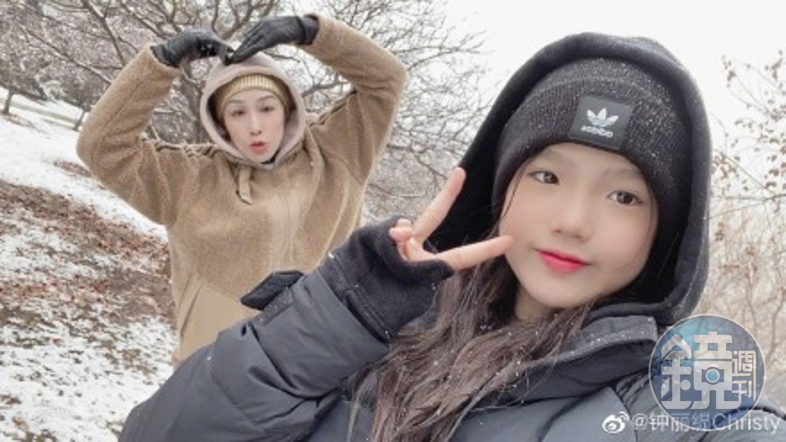 50歲的鍾麗緹,經常透過社群平台分享自己和女兒們的日常生活照。(翻攝自鍾麗緹微博)Jaden因長得較像父親,沒有深邃的五官,每次和姊妹合照,總是顯得較為平凡,不過日前鍾麗緹帶女兒們出門玩雪,Jaden掌鏡和媽媽自拍,白皙肌膚配上紅唇亮麗了許多,五官也變越來越漂亮,網友讚她有韓系小少女的味道,形容她是「整容式長大」的少女。