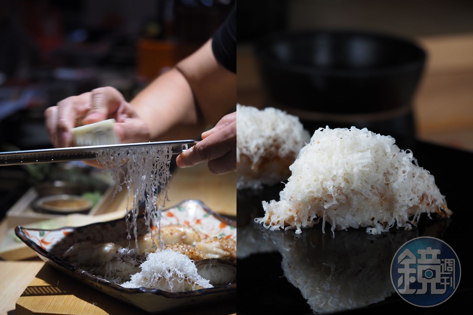 爽脆帶油脂的比目魚緣側(鰭邊肉)劃刀炙燒後淋上鰻骨醬汁,再毫不留情刨上義大利松露起司,是只有在「米匠」才吃得到的Special Menu。發布時間:2020.11.27 08:00 臺北時間