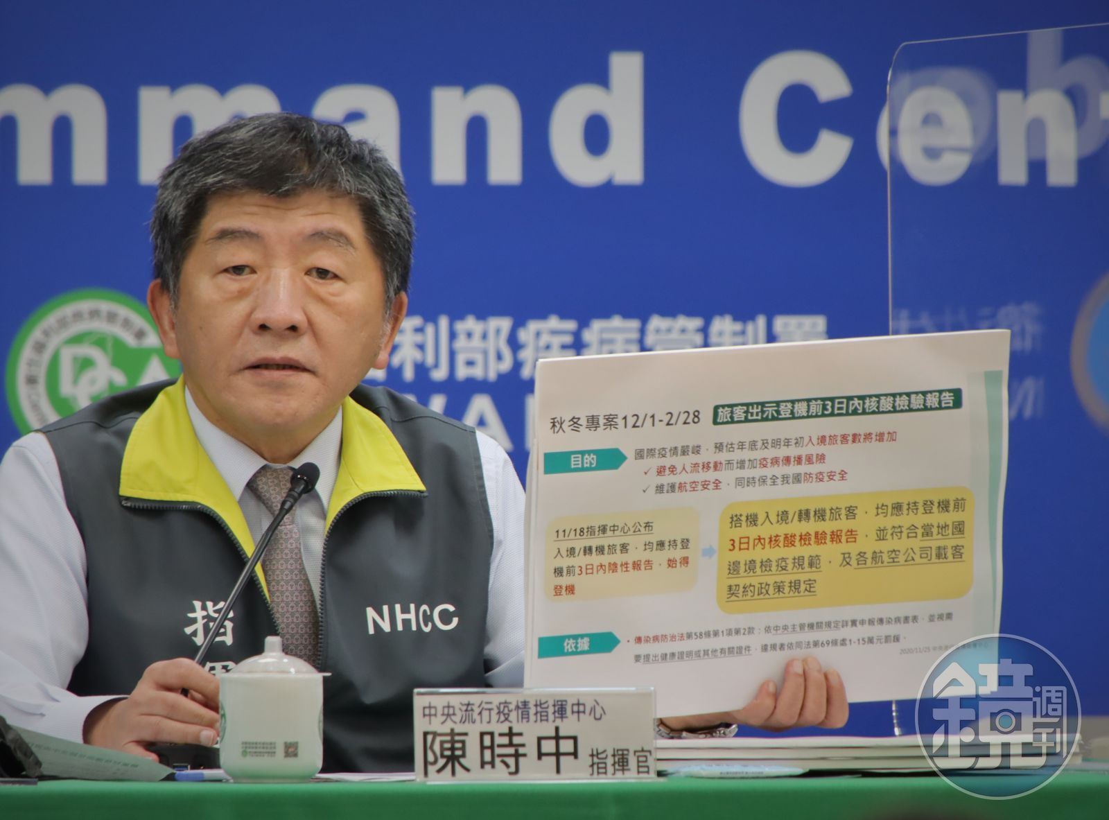 陳時中表示,若旅客登機前無法出示3日內的核酸檢驗報告,但符合以下3種情形,不予裁罰。(適用對象包括本國人、持居留證之外籍人士及持居留證之陸港澳人士;經台轉機旅客不適用。)