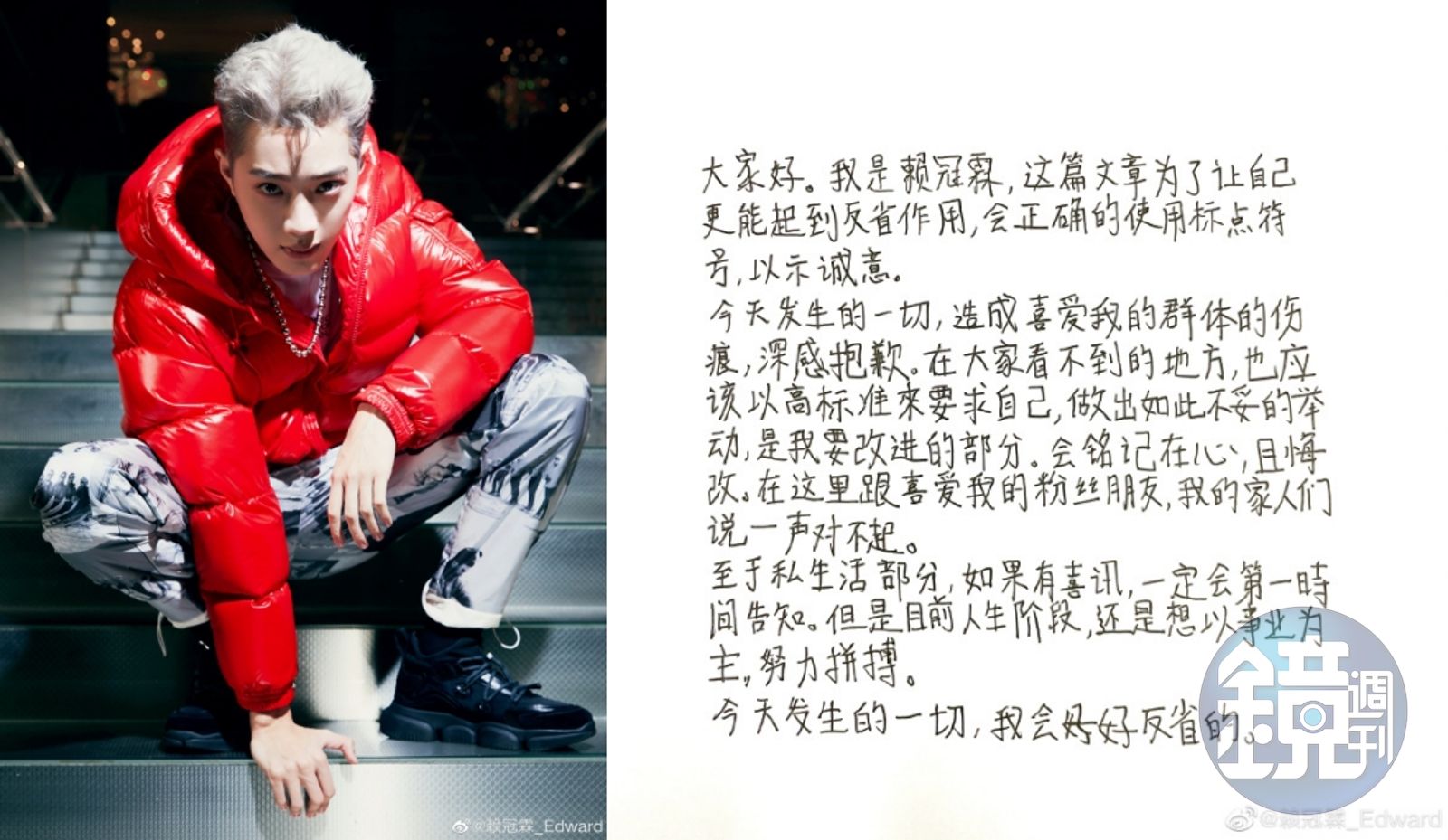 賴冠霖以手寫信再度為自己行為道歉。(翻攝賴冠霖微博)發布時間:2020.11.25 12:39 臺北時間