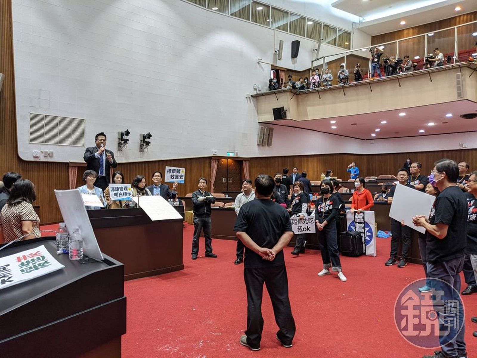 行政院長蘇貞昌今(27日)赴立法院進行施政報告,國民黨立委拿出預先準備的豬內臟潑灑,讓議場瞬間瀰漫「腥味」,並在其他小黨立委上台質詢時鳴笛干擾,時代力量立委邱顯智只能無奈站到椅子上進行質詢,並批評國民黨「剝奪小黨質詢權利,連當個在野黨也不會」。