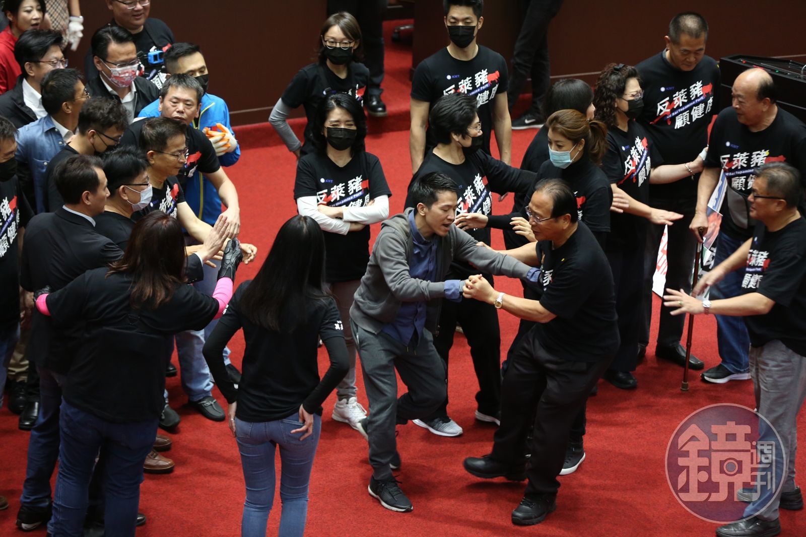 此時,國民黨立委聚集在發言台前,由總召林為洲以自備音箱發言,要求依照議程進行國是論壇程序。林強調,蘇貞昌對美豬進口昨非今是道歉都做不到,連國是論壇民進黨立委都要沒收,國民黨團已登記,也抽出順序,國是論壇應該先處理。隨後他率領藍委高喊,「國是論壇要進行,程序問題要處理!」