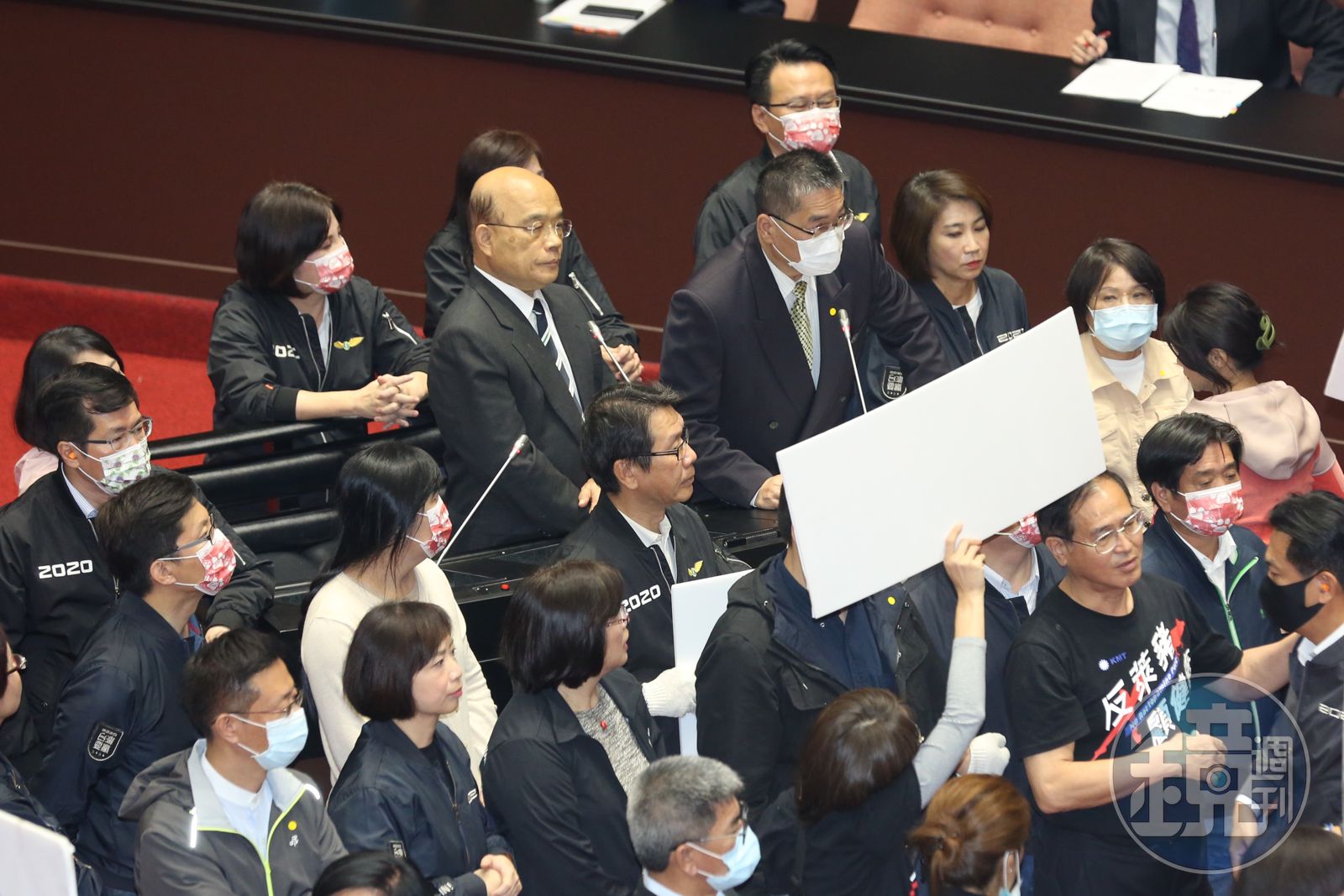 國民黨團總召林為洲雖訴求蘇貞昌應先道歉,才能上台,不過,今天10點一到,蘇貞昌進場入座,隨後立法院長游錫堃進場主持會議,在藍委不斷鳴汽笛、吹哨干擾下,讓會議開始。