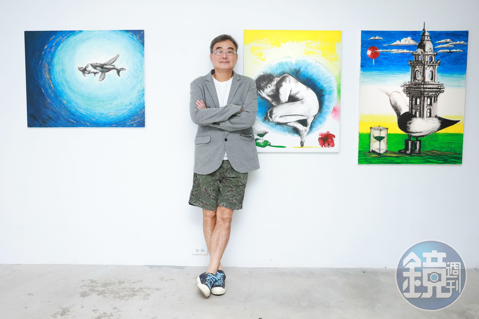 陳昇以招牌短褲搭配休閒西裝外套,出席自己與好友藝術家黃志偉籌備已久的畫展《末日遺緒Finale -陳昇╳黃志偉兩人展》。(新樂園製作提供)發布時間:2020.11.28 21:33 臺北時間