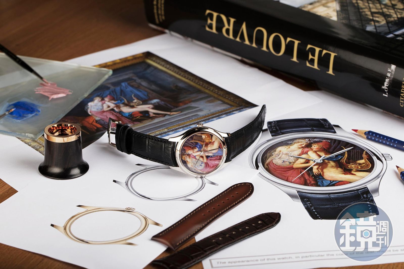 選定藝術品之後,江詩丹頓會提供兩種不同的琺瑯工藝技法,包括灰階琺瑯或微繪琺瑯,在此江詩丹頓給了一個建議:如果是畫作將建議以微繪琺瑯、雕塑品則是灰階琺瑯,這來自於工匠技師的美學經驗,他們認為這樣能讓藝術作品表現的更栩栩如生。當然,最終決定權還是在得標者身上。除此之外,藝術品放在面盤上的比例跟大小也是能依照得標者的要求來呈現,至於錶殼的材質則可從白金、玫瑰金與鉑金之中做選擇,而從錶帶皮料到縫線的顏色樣式都可自行決定。