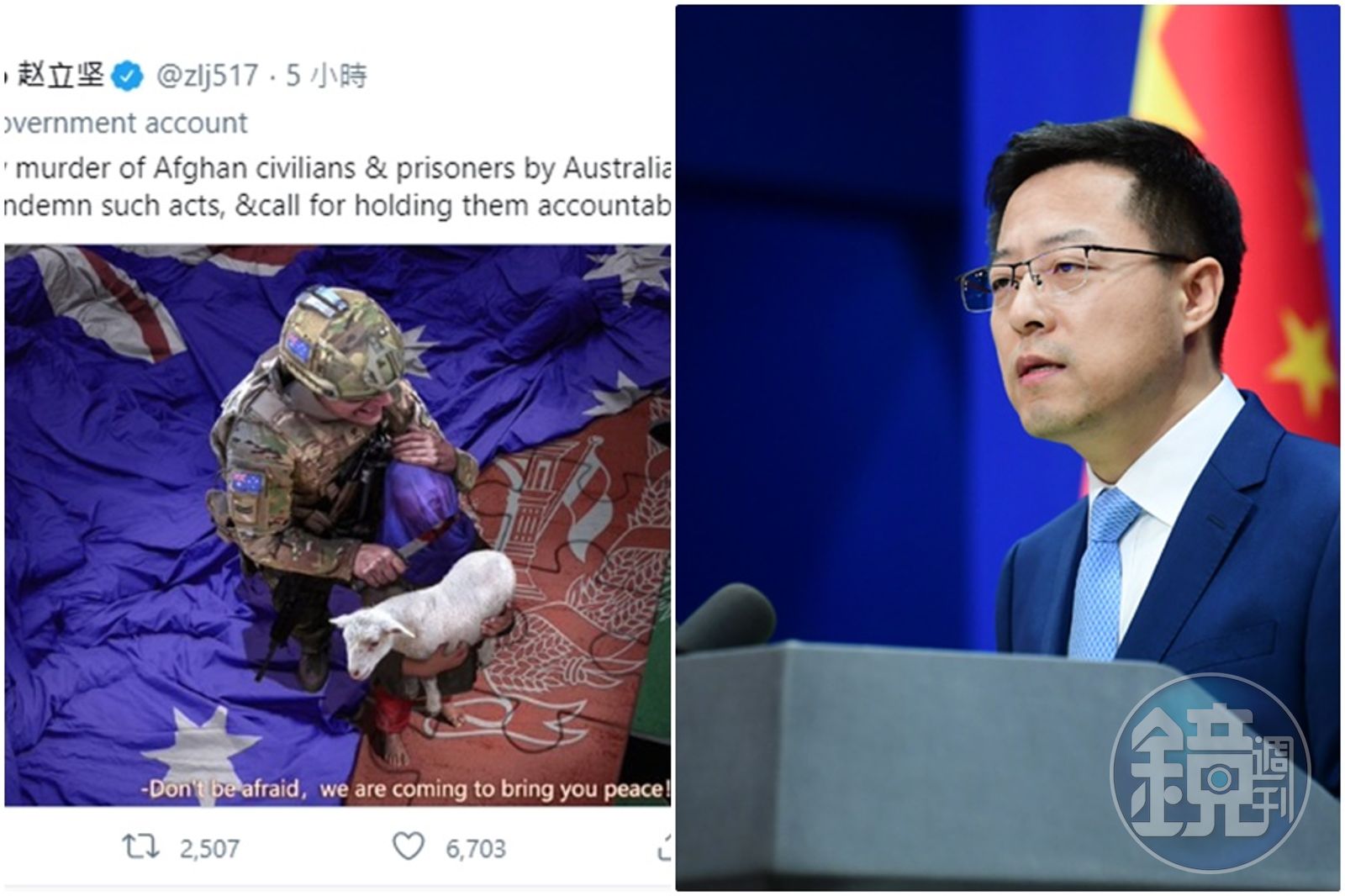 趙立堅今在推特上貼出一張諷刺照片,畫面中一名士兵將阿富汗牧羊男孩裹著澳洲國旗,手持刀子底著男孩的喉嚨,暗諷澳洲軍人殺害阿富汗公民和俘虜,圖上寫著「不要害怕,我們會為您帶來和平」。貼文則寫道「他被澳洲士兵謀殺阿富汗公民和俘虜所震驚,強烈譴責這種行為,要求追究他們的責任」。