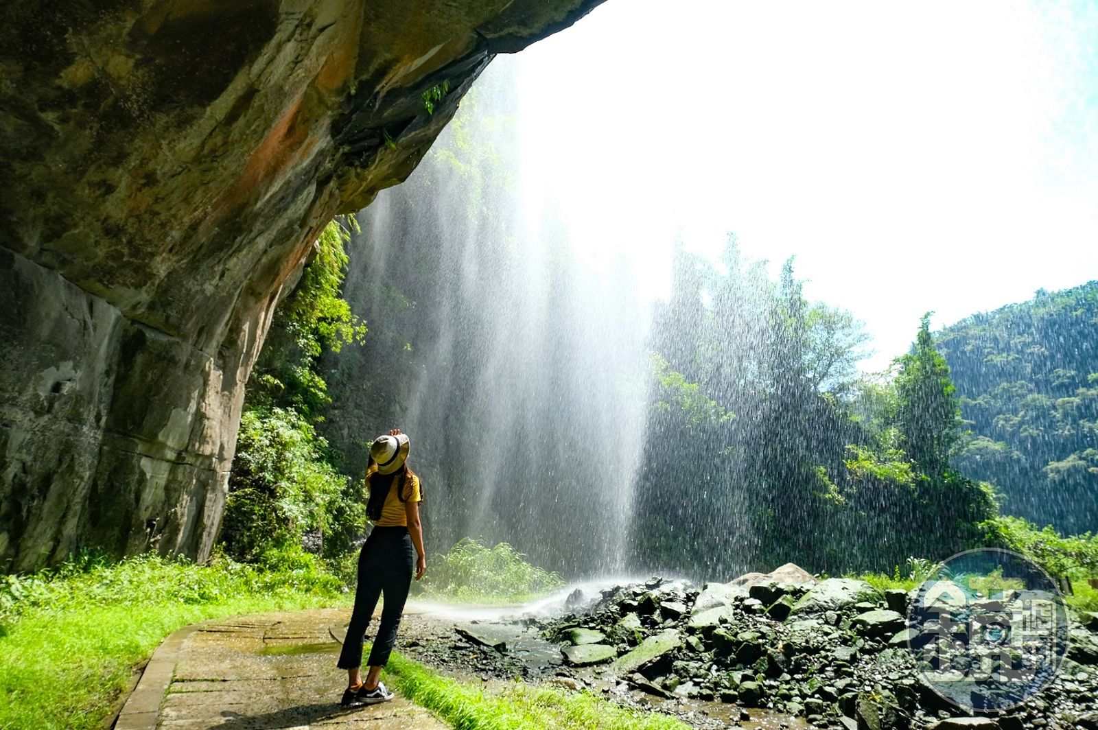 原來走到最下方即是水濂洞瀑布,剛才的溪水自此在斷崖石壁上奔騰而下,崖壁下方還有一個巨大洞穴,高約20公尺的懸谷式瀑布,在底部欣賞更形壯觀。瀑布依據雨季時的水量而變化,水量少時,水瀑如薄紗,還會隨著風飄動,水量大時,氣勢磅礡。我們穿過水幕、進入洞穴,此時從洞裡欣賞的水濂洞瀑布,形成逆光水幕又是另一番美景。