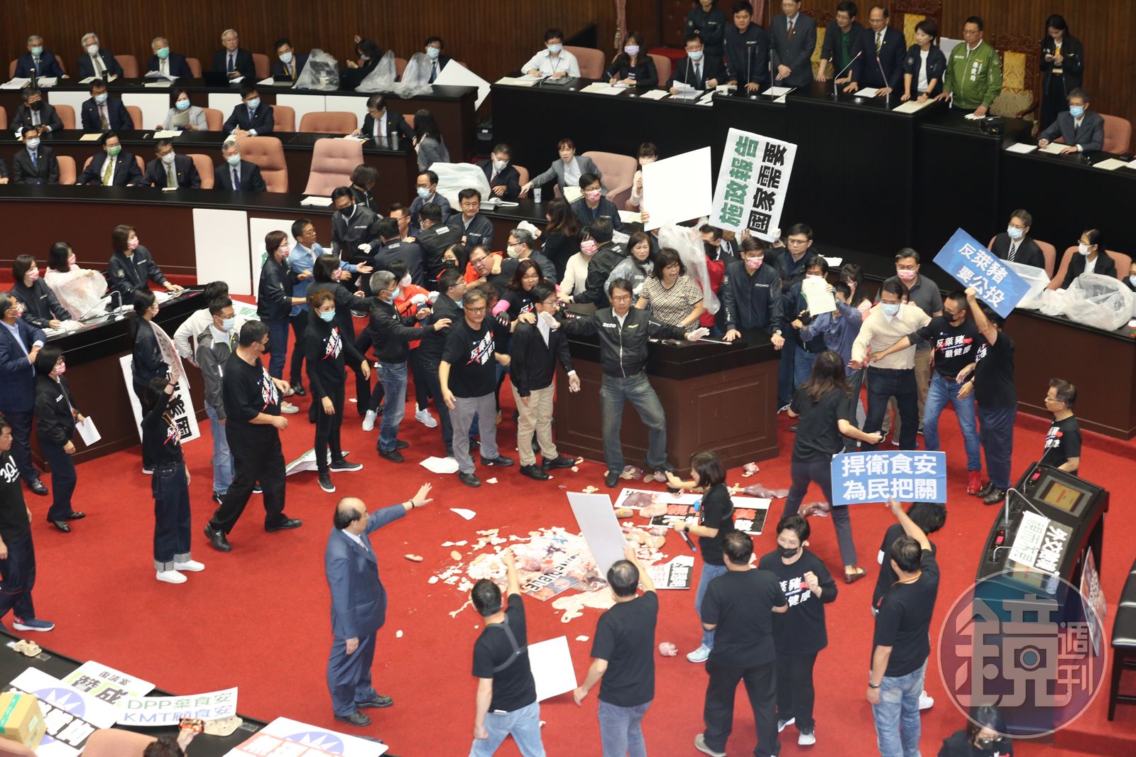 試圖阻止行政院長蘇貞昌赴立院進行施政報告,並凸顯萊豬進口爭議,國民黨上週五在立法院內不斷朝向主席台丟豬內臟、亂鳴笛,導致現場一片混亂,荒唐行為更因此鬧上國際版面。