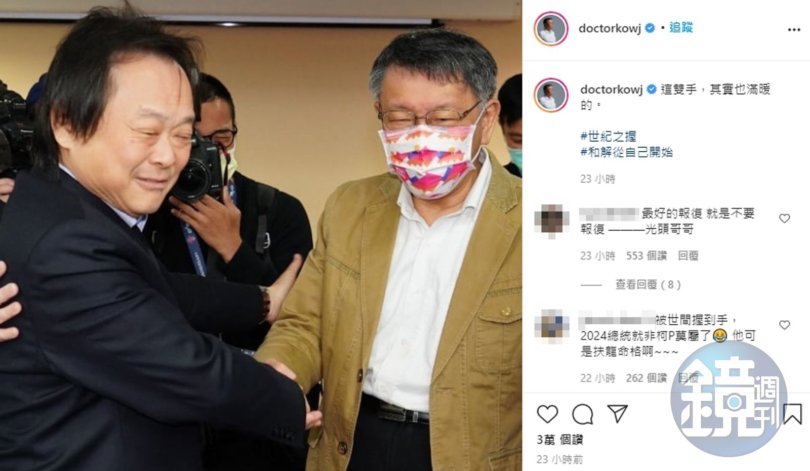 王世堅今天受訪表示,昨天是6年來第一次握柯文哲的手,而柯文哲昨天也在IG放上和王世堅握手的照片,表示:「這雙手,其實也滿暖的」,還標記「世紀之握」「和解從自己開始」。