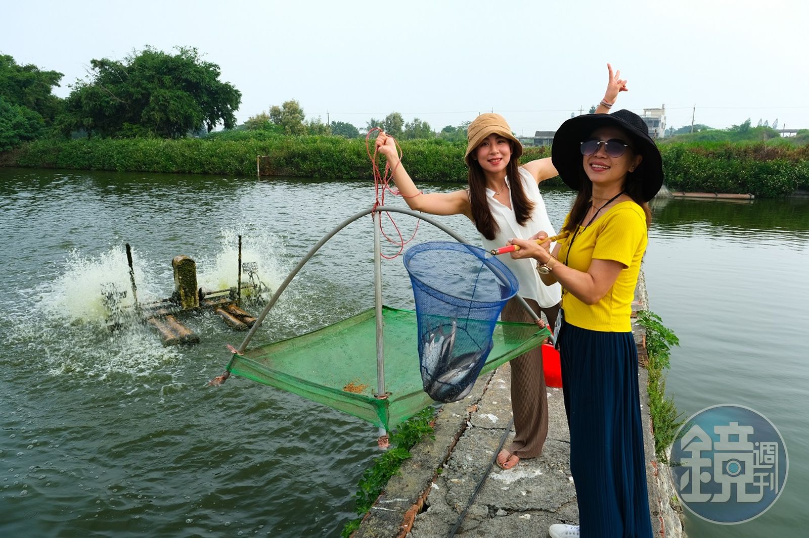 接著我們拿起四角蝦網和手網來到戶外,準備進行撈魚蝦的體驗,阿正說,養殖和務農最大不同在於「看不到」,所以手持蝦網、餵食飼料,或是檢查魚蝦健康來觀察變得十分重要。當我們將網上飼料放入池中,沒一會兒就有貪吃魚兒被撈起,剛進食的魚蝦其實肚子還有飼料,並不適合馬上煮來吃,不過這難得的撈魚體驗,能近距離與活跳跳魚兒拍照就很興奮了。