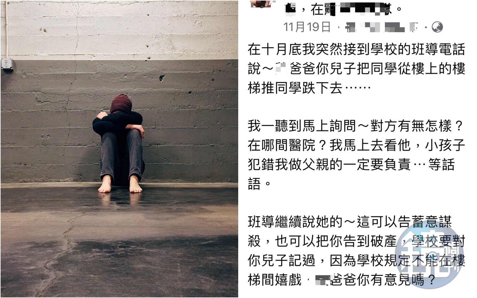 家長在臉書透露,上月底突然接到導師來電表示:「你兒子把同學從樓梯上推下去」,網友一聽隨即關心對方狀況,並表明會負責到底。但導師卻接著說:「這可以告蓄意謀殺,也可以把你告到破產,學校要對你兒子記過,因為學校規定不能在樓梯間嬉戲」,並詢問家長「有沒有意見?」