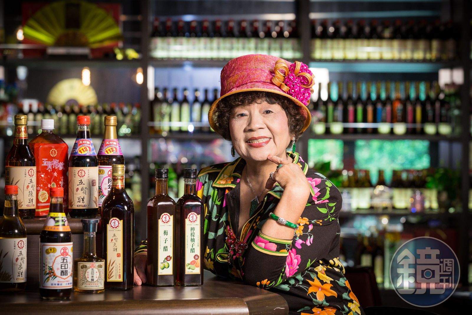 她頭戴別有大禮花的螢光粉禮帽,一身法國名牌LEONARD PARIS黑底印花洋裝,還別著紅蜻蜓胸針,「我是高家的代言人,我從26歲就喝醋,你看我穿高跟鞋,也可以這樣。」她瞬間站立,身體前彎雙手摸地,展現柔軟身段,鞋上的水晶蝴蝶結與身上成套的翡翠配飾爭奇鬥亮。