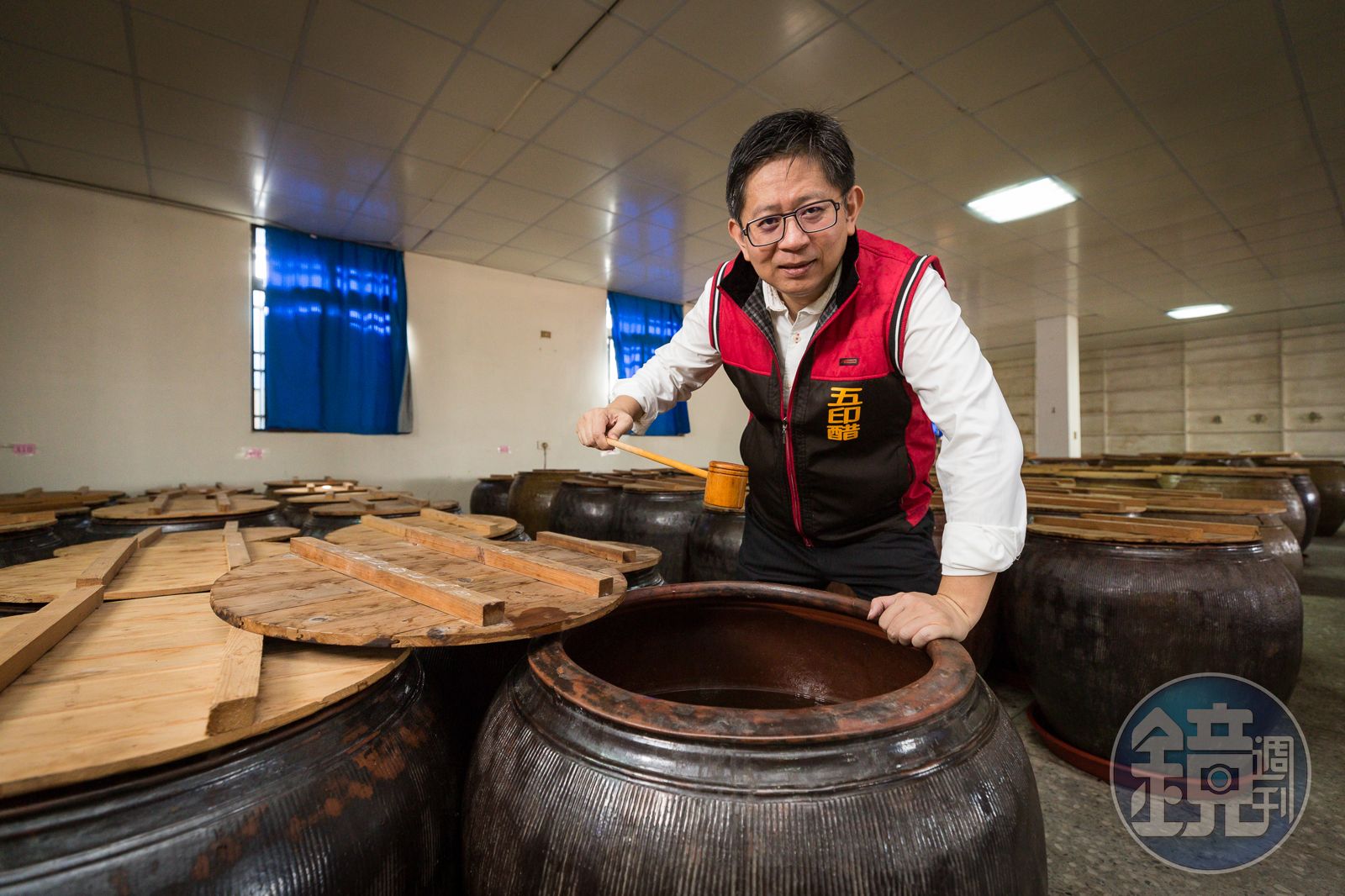 高奇平的白襯衫越發透明,額頭冒出豆大汗珠,「這裡如果沒有遮,會西曬,夏天開冷氣維持在25度。如果天氣突然異常,太冷沒辦法發酵;太熱,菌就不工作。其實,我的員工有好幾千兆個,你看,一甕裡有多少酵母菌、醋酸菌。」也因環境與時間限制,產量有限,即使前幾年某家製醋大廠爆發食安問題,高記詢問度變高,「量還是做不出來,我們是看天吃飯。」
