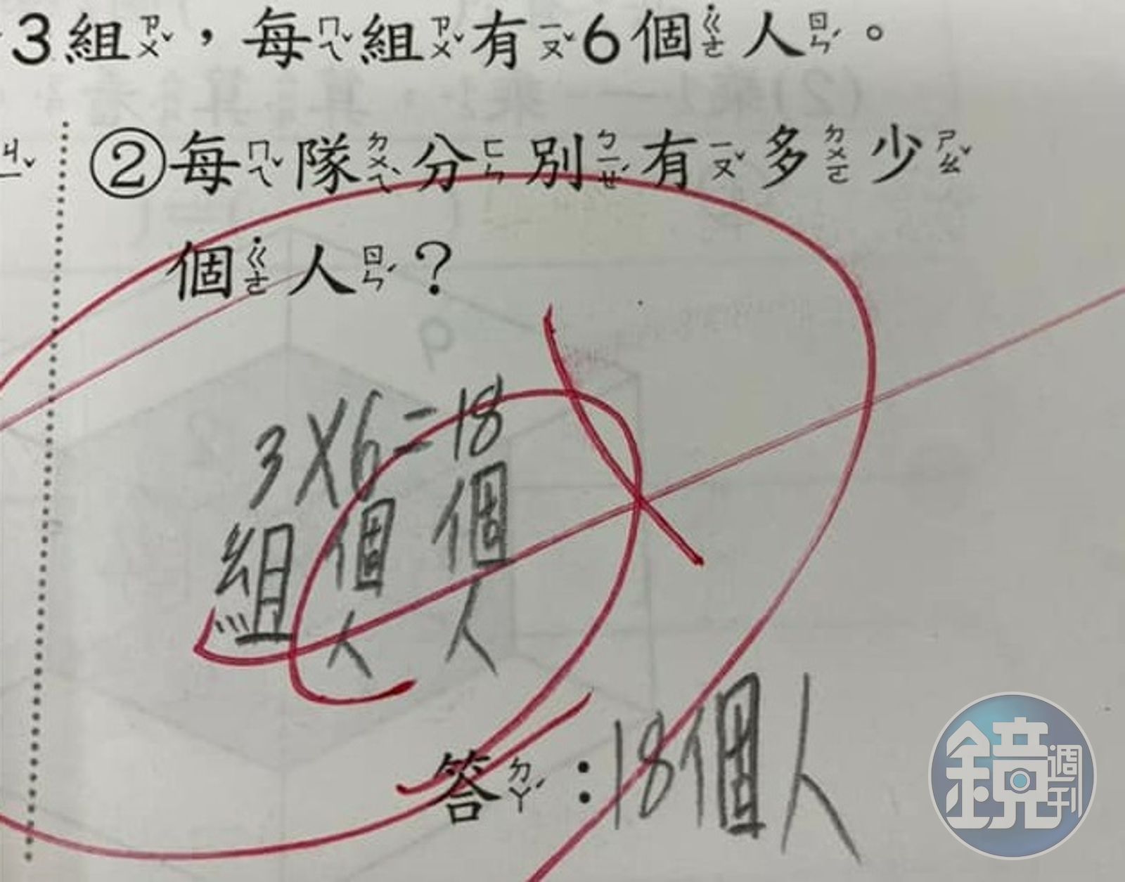 一名家長在日前在臉書「爆怨公社」發文,貼了小二生的國小數學考卷,題目是「童軍節活動,每個學校都會安排4隊學生參加,每隊分成3組,每組有6個人」,其中一小題問到「每隊分別有多少個人?」,而小孩答案寫「3組X6個人=18個人」卻被老師改錯。