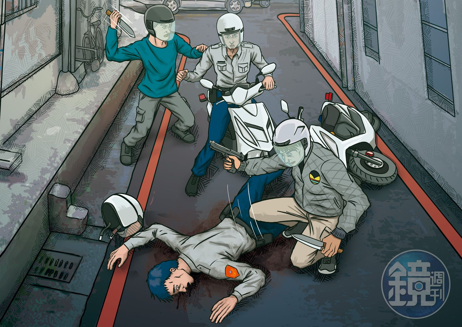 其他目擊者指出,洪姓員警負傷倒地後,歹徒轉身砍殺張姓員警,滿身是血的洪,不顧自己的傷勢,拚命緊抱歹徒的雙腳不放,歹徒一怒之下,又回頭朝洪的胸口猛刺多刀,鮮血狂噴的洪姓員警仍緊緊抓著歹徒不放,直到氣力用盡、不支倒地,2名歹徒才騎車逃逸。