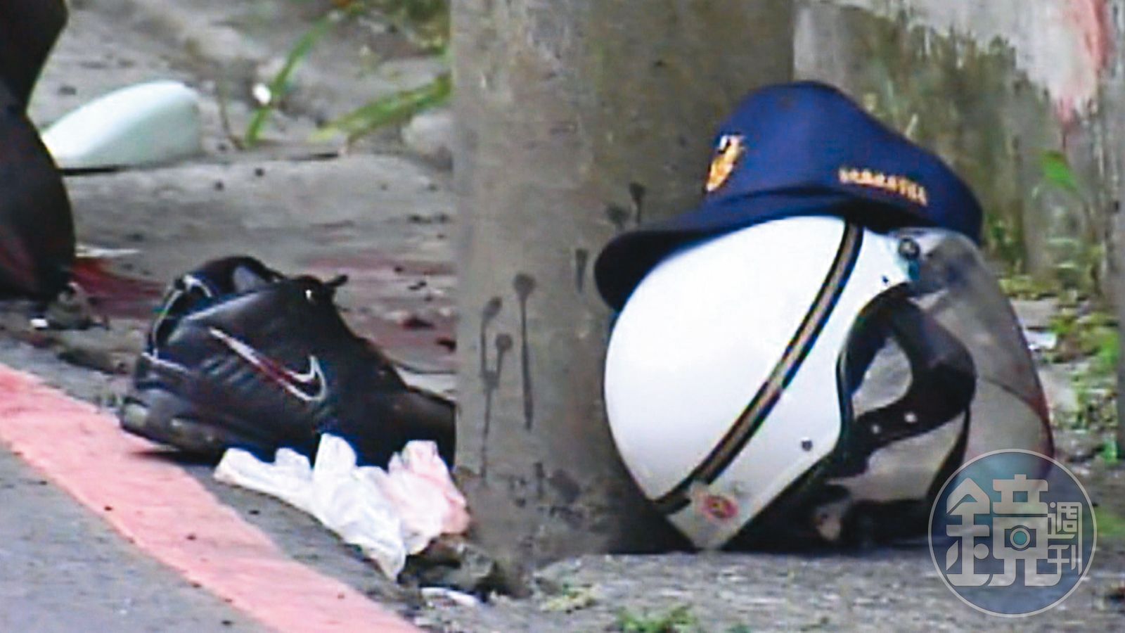 2名員警1死1重傷,他們的安全帽、警帽、鞋子則掉落在現場。(東森新聞提供)發布時間:2020.12.07 05:58 臺北時間