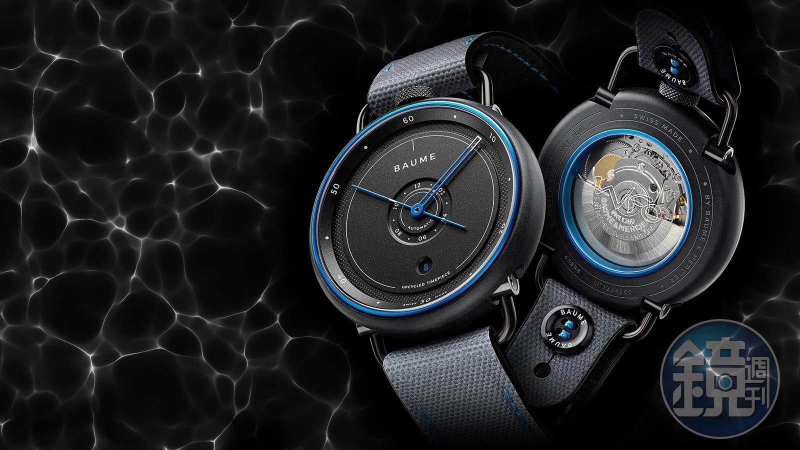 這幾年錶界滿多品牌開始用環保材質當作素材,像是今年雅典(ULYSSE NARDIN)就推出以回收漁網及和海洋回收塑料做成錶殼的Diver Net概念錶、其他還有百年靈(BREILTING)也開始採用環保錶盒。而最近名士(BAUME & MERCIER)旗下的子系列BAUME也主打以回收材質製作的錶殼,而且只在網路上販售,從概念、設計到行銷層面都是很貼近新世代的思維。 BAUME海洋限定款自動腕錶|錶徑42mm/回收聚丙烯材質錶殼/時間及日期指示/自動上鏈機芯/防水約30米/建議售價USD 1,490 (約台幣42,000)BAUME奔系列是今年五月正式被歸在名士錶(BAUME & MERCIER)旗下的產品線,位在12點鐘位置的錶冠、線型錶耳概念的設計、鈕扣結構的快拆錶帶、還有面盤的設計配置都和名士本家很不一樣,風格比較年輕化、價位也相對好入手,是名士用來開拓偏好設計導向以及年輕族群的產品線。