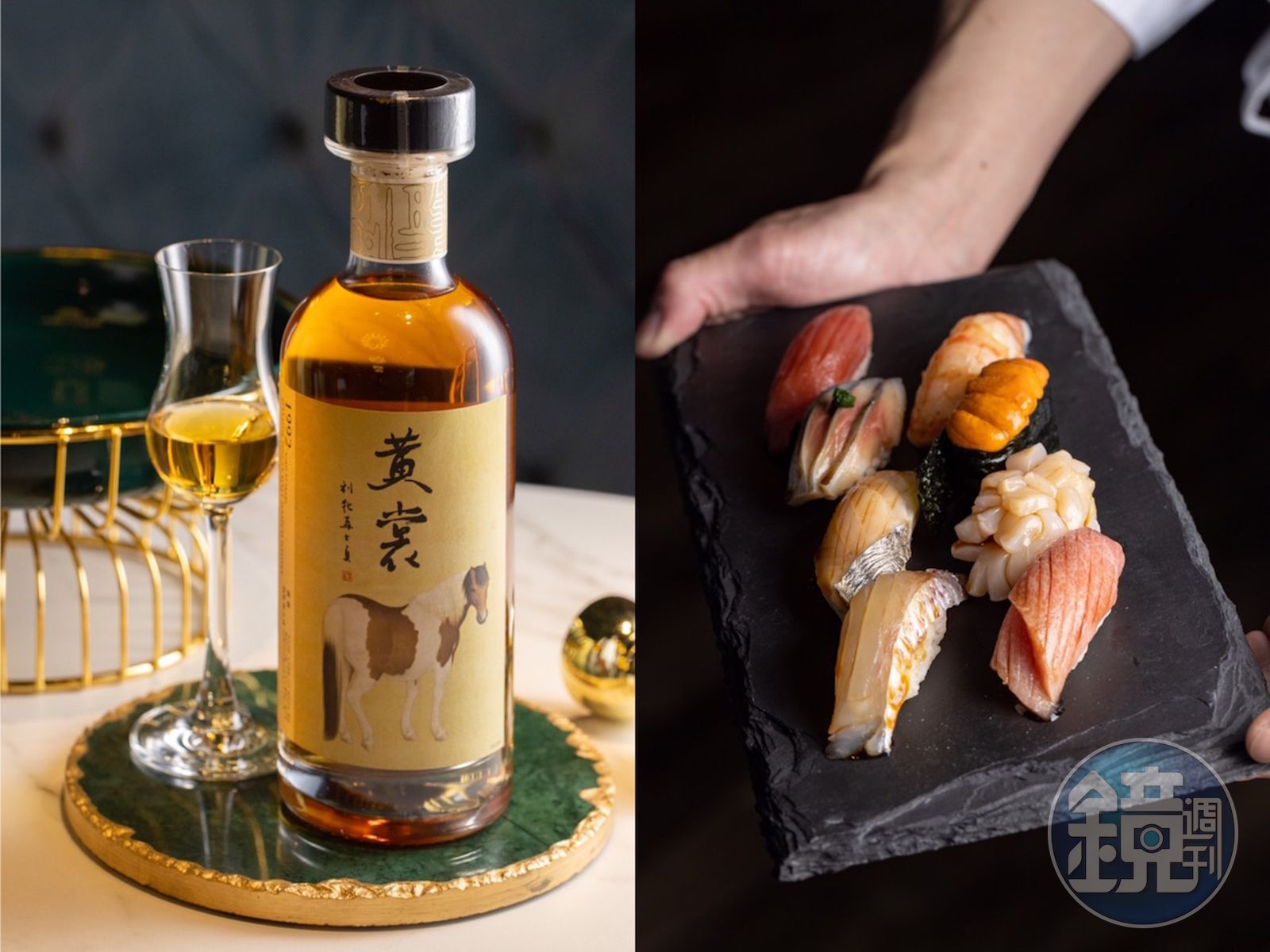 譬如,海味濃郁的青花魚、馬糞海膽等握壽司,搭配林一峰個人包桶、貼有故宮館藏書畫器物圖片的「執杯大叔 黃裳」,帶有醃漬百香果、李子等熱帶水果香氣的烈酒,為魚生的脂潤增香。