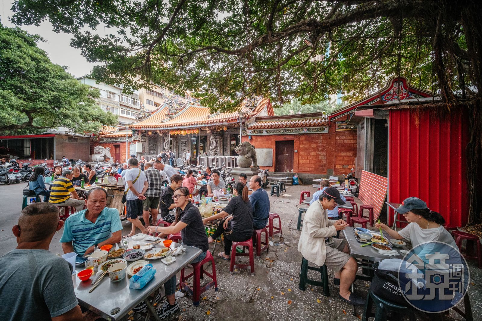 集中在慈聖宮媽祖廟前的廣場上,饕客們坐在榕樹下聊天吃著銅板美食。發布時間:2020.12.19 08:00 臺北時間