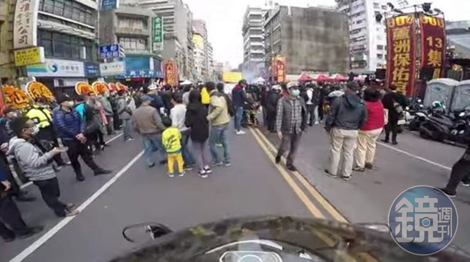 影片中,林男無視路邊一整排警示路障,以及遶境隊伍就在前方不遠處,硬是騎進管制區與行人爭道,因此很快就被員警攔下,好言勸說道「繞路」,但他仍執意要往前騎,此時恰好遇上迎面而來的遶境隊伍,雙方一度卡在中央。