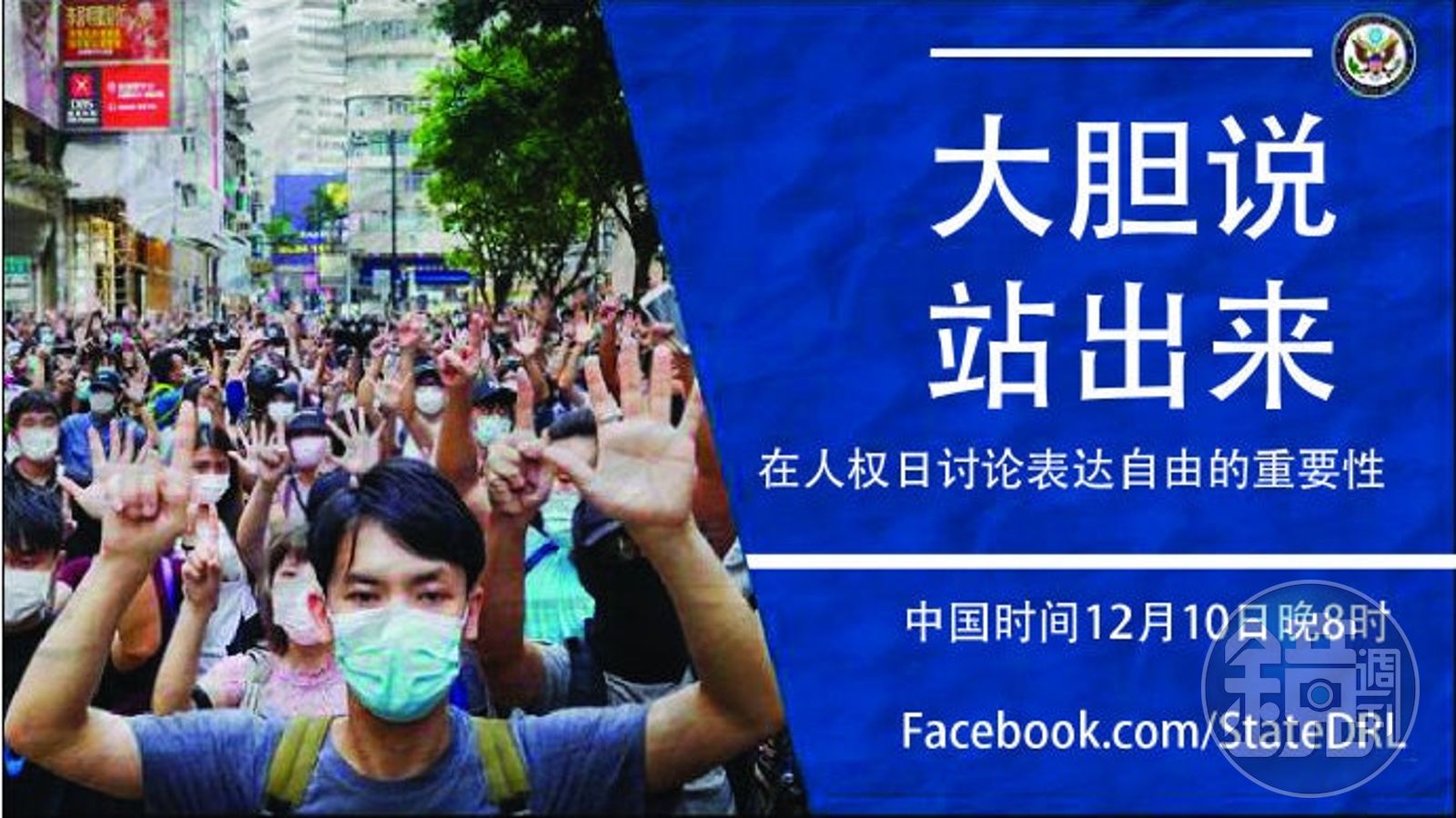 美國駐中國大使館於世界人權日前夕在微博發文,指出大膽說出自己對事情的看法,並參加和平抗議是一個自由社會裡公民生活最基本的,這些權力應當受到保護而非遭到壓制。另外也分享該機構為世界人權日舉辦的公民參與政府和機構問責等討論活動。微博貼文中還貼出香港示威者上街比出「五大訴求,缺一不可」的照片。 此舉也引發中國網友反彈,紛紛在貼文底下嘲諷「繼續佔領華爾街去」「你提倡什麼你就缺什麼,你們的邏輯,病死也是人權,因為他有選擇死亡的權利」「為什麼你們總統在推特上發東西,推特會屏蔽他,這就是你們所謂的自由嗎」。