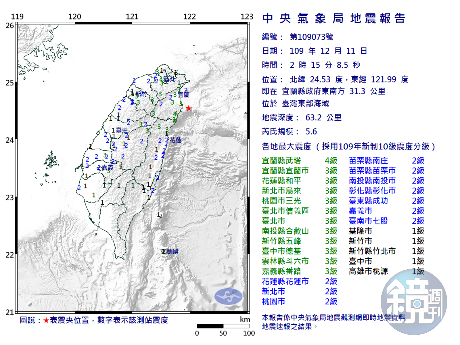 根據中央氣象局最新資料顯示,今凌晨2點15分發生芮氏規模5.6地震,震央位於宜蘭縣政府東南方31.3公里、台灣東部海域,地震深度為63.2公里。 最大震度落在宜蘭縣地區達4級;花蓮縣、新北市、桃園市、台北市、南投縣、新竹縣、台中市、雲林縣及嘉義縣為3級;苗栗縣、彰化縣、台東縣、嘉義市及台南市為2級;基隆市、新竹市及高雄市則為1。 凌晨突然再度發生地震,讓不少民眾從睡夢中驚醒,許多人也湧入PTT留言表示,「是不是今晚可以不用睡了」「是要搖幾次啦」「一直下雨一直震」「我每次都是被警報嚇到」。