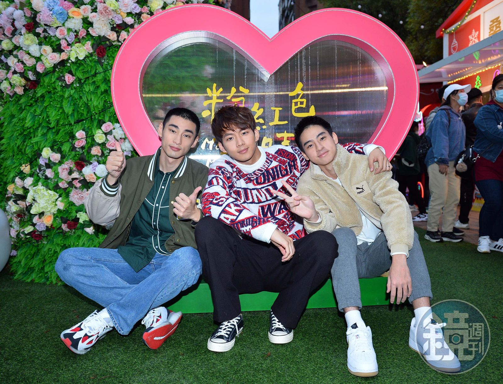 台劇《粉紅色時光》熱播中,劇中的小鮮肉演員吳念軒、章廣辰與劉敬,昨(12日)傍晚特別快閃新北歡樂耶誕城和粉絲互動,粉絲見到偶像簡直嗨翻天,小鮮肉演員們也祭出「粉紅茄芷袋」送給支持《粉紅色時光》的粉絲們。