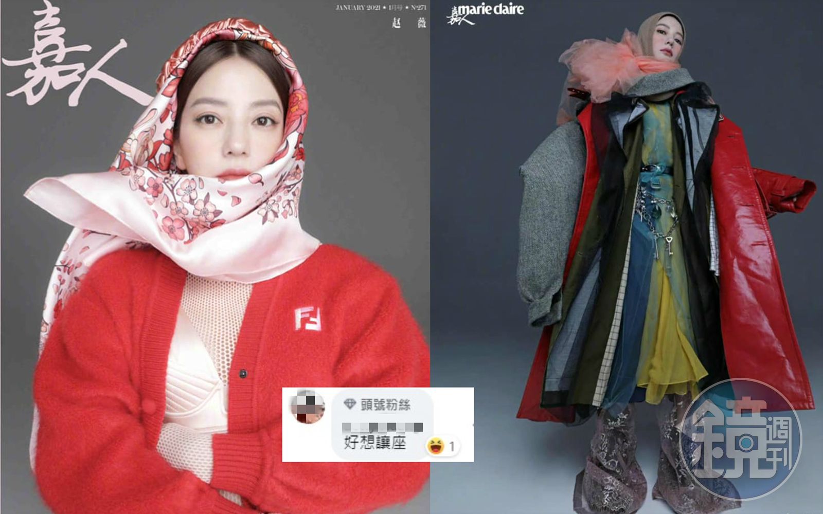 在內頁的時尚大片,趙薇再次詮釋個人的百變魅力。特別是層層疊疊的披掛多套穿搭,展現出立委高嘉瑜的租屋處,因囤物症導致衣服堆積如山、宛如資源回收廠的後現代時尚主義,傳達的時尚哲學引人深思。