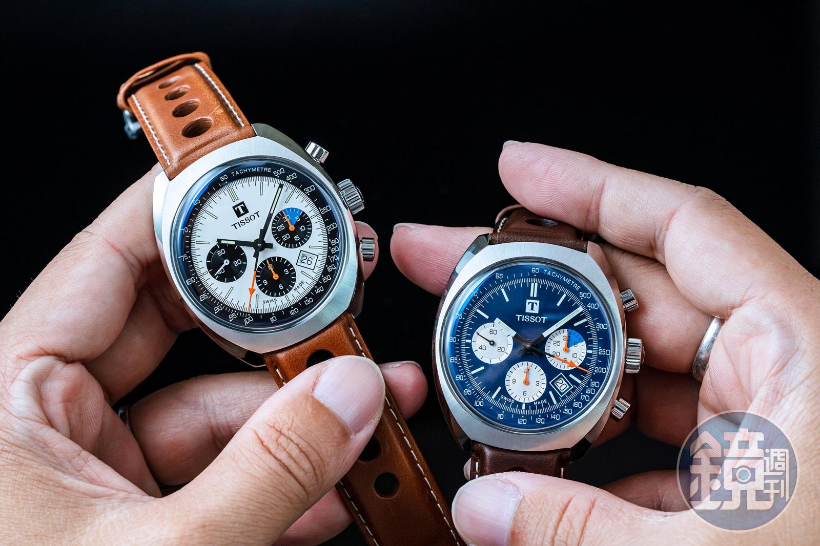 去年天梭發表了Heritage 1973計時碼錶(詳情請見連結),設計靈感來自1973年的Navigator腕錶,從錶殼到錶耳的造型,以及面盤的配色都承襲當年歷史錶款的面貌。今年品牌推出兩款延伸的型號,同樣是Heritage 1973,除了改為非限量的版本之外,還有什麼其他更動? Heritage 1973計時碼錶,白面黑盤的熊貓面,配上復古賽車風棕色錶帶,定價NT$68,500。今年天梭新推出的Heritage 1973計時碼錶有兩種款式,一款仍然是白面黑盤的熊貓面配色,而全新的顏色則是以藍面白盤來呈現。與前一版最明顯的差別,是3點鐘位置處代表30分鐘積分盤的0-5分鐘位置用了不同的色塊,更有早期賽車錶計時器的感覺。