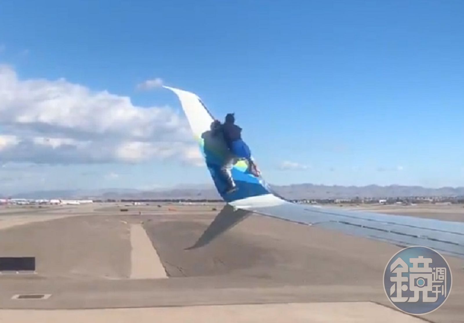 上週六(12日)在美國麥卡倫國際機場(McCarran International Airport)發生一場鬧劇,一班阿拉斯加航空航班正準備起飛時,機翼上竟然有一名男子在行走,甚至想攀爬翼梢,讓機內乘客嚇了一大跳。