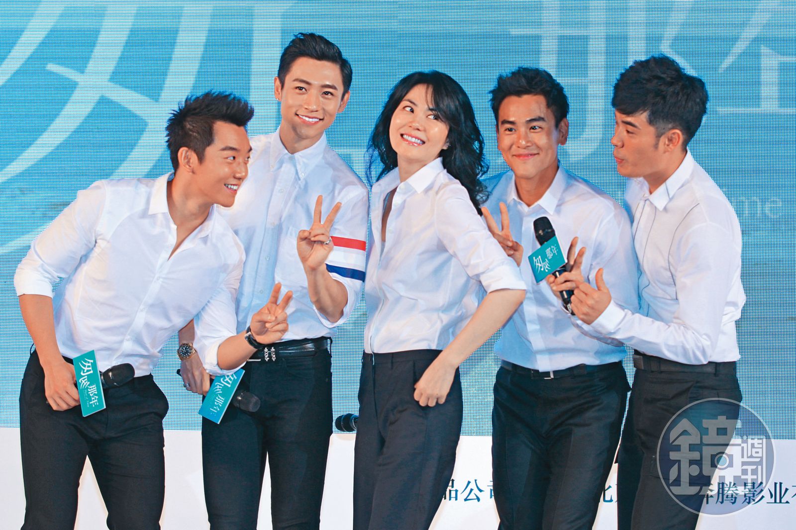 王菲(中)為彭于晏(右二)和倪妮主演的電影《匆匆那年》,演唱主題曲〈匆匆那年〉,與鮮肉們開懷互動。(東方IC)發布時間:2020.12.16 05:58 臺北時間