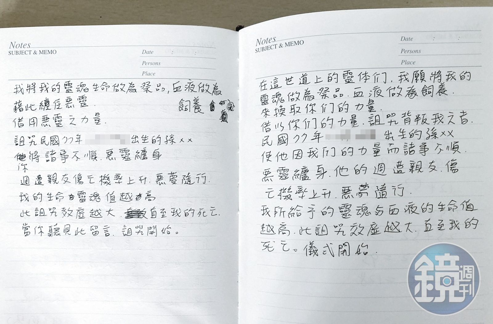 L女表示,她被性侵後一直覺得自己很髒,還因此罹患重鬱症、恐慌症、焦慮症,需靠藥物入睡,甚至多次割腕自殺,但孫男卻逍遙法外,所以她在某次自殘前,特別寫了詛咒信,上面除了記載孫的出生年月日,內容還寫道:「我將我的靈魂生命做為祭品,血液做為飼養…詛咒…孫○○你將諸事不順、惡靈纏身,周遭親友傷亡機率上升、惡夢隨行…直至我的死亡…詛咒開始!」