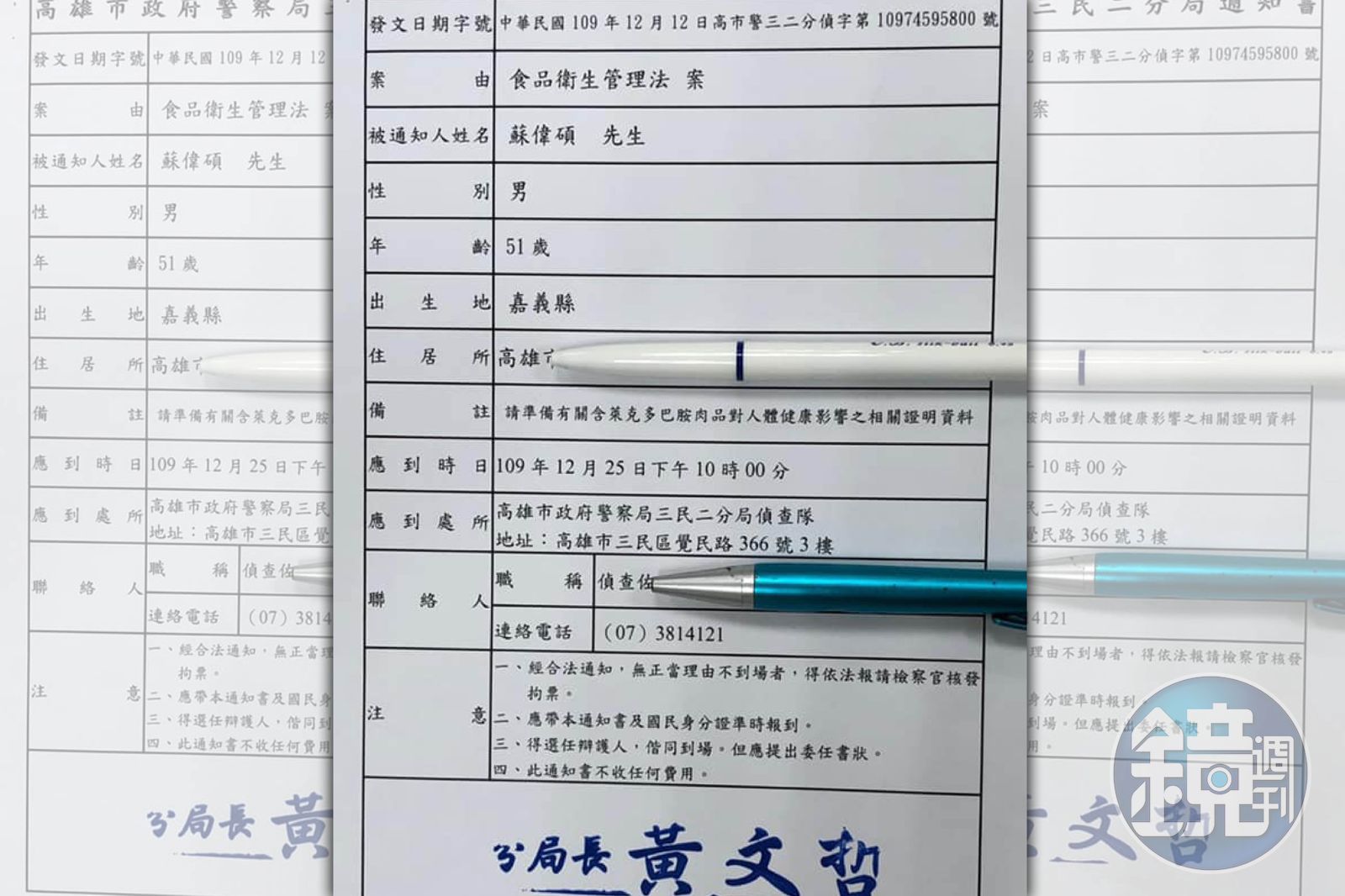 根據民眾所提供的爆料資料,內容為高雄市三民二分局的通知書,要求蘇偉碩在12月25日晚上10時到案說明,並請準備「有關含萊克多巴胺肉品對人體健康影響之相關證明資料」。