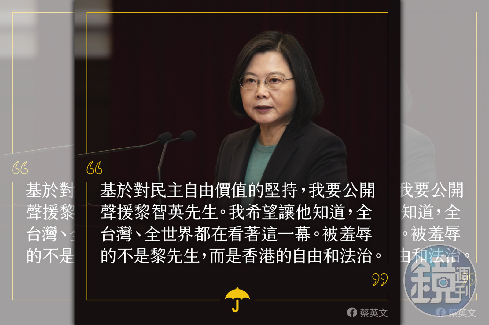 蔡英文強調,世界人權日才剛過,香港自由人權的寒冬卻正凜冽;「基於對民主自由價值的堅持,我要公開聲援黎智英先生,我希望讓他知道,全台灣、全世界都在看著這一幕,被羞辱的不是黎先生,而是香港的自由和法治。」
